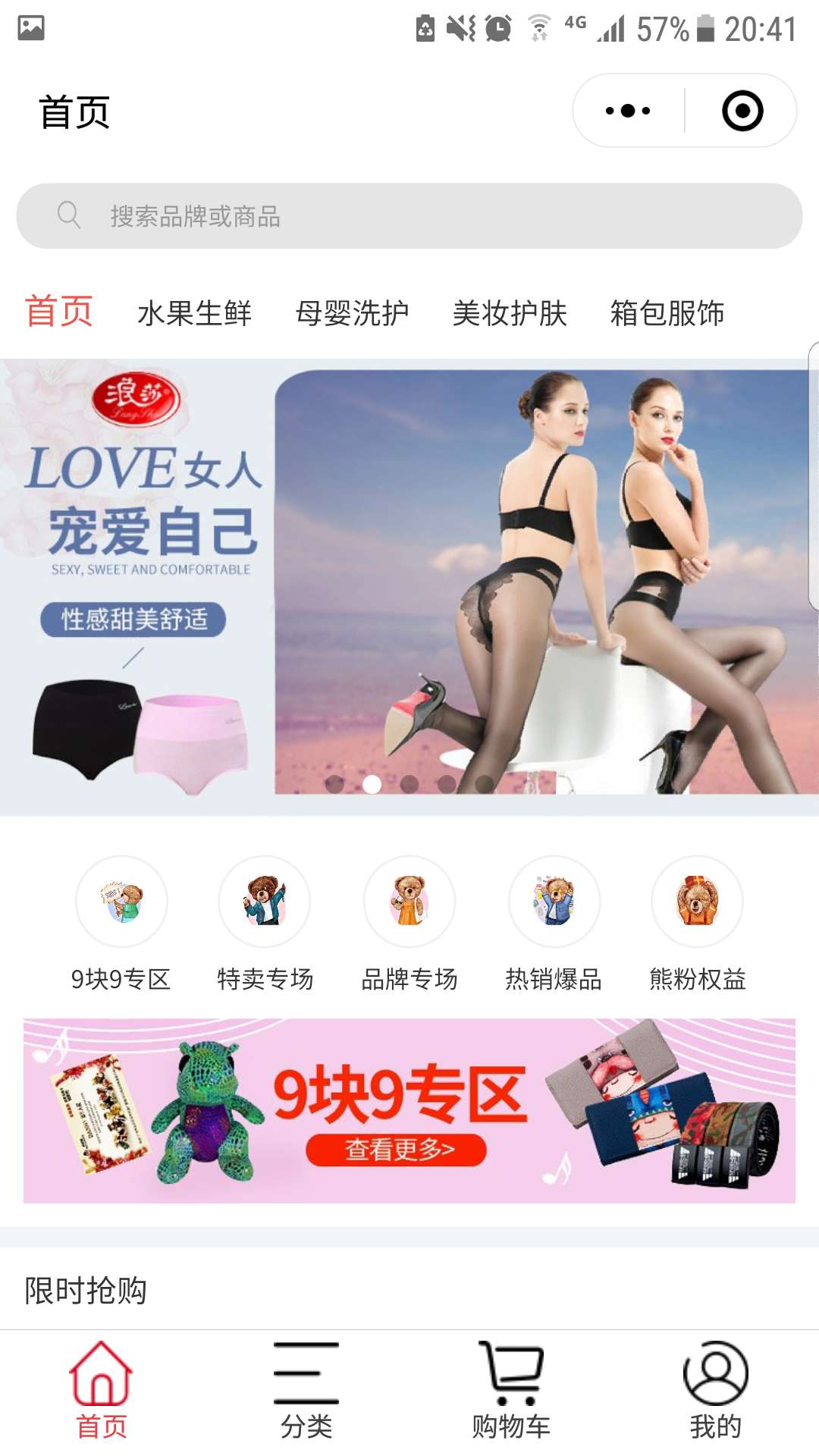 3、熊呗自营专区:熊呗商品以一个图标的形式展示在首页,点击跳转到熊呗的商品页面,商品页面包含熊呗的商品列表,每项 商品 列表包含商品图片,商品名称 ,商品价格,库存,加入购物车按钮,点击商品会跳转到商品详细页,点击加入购车按钮,跳转到加入购物车页面。